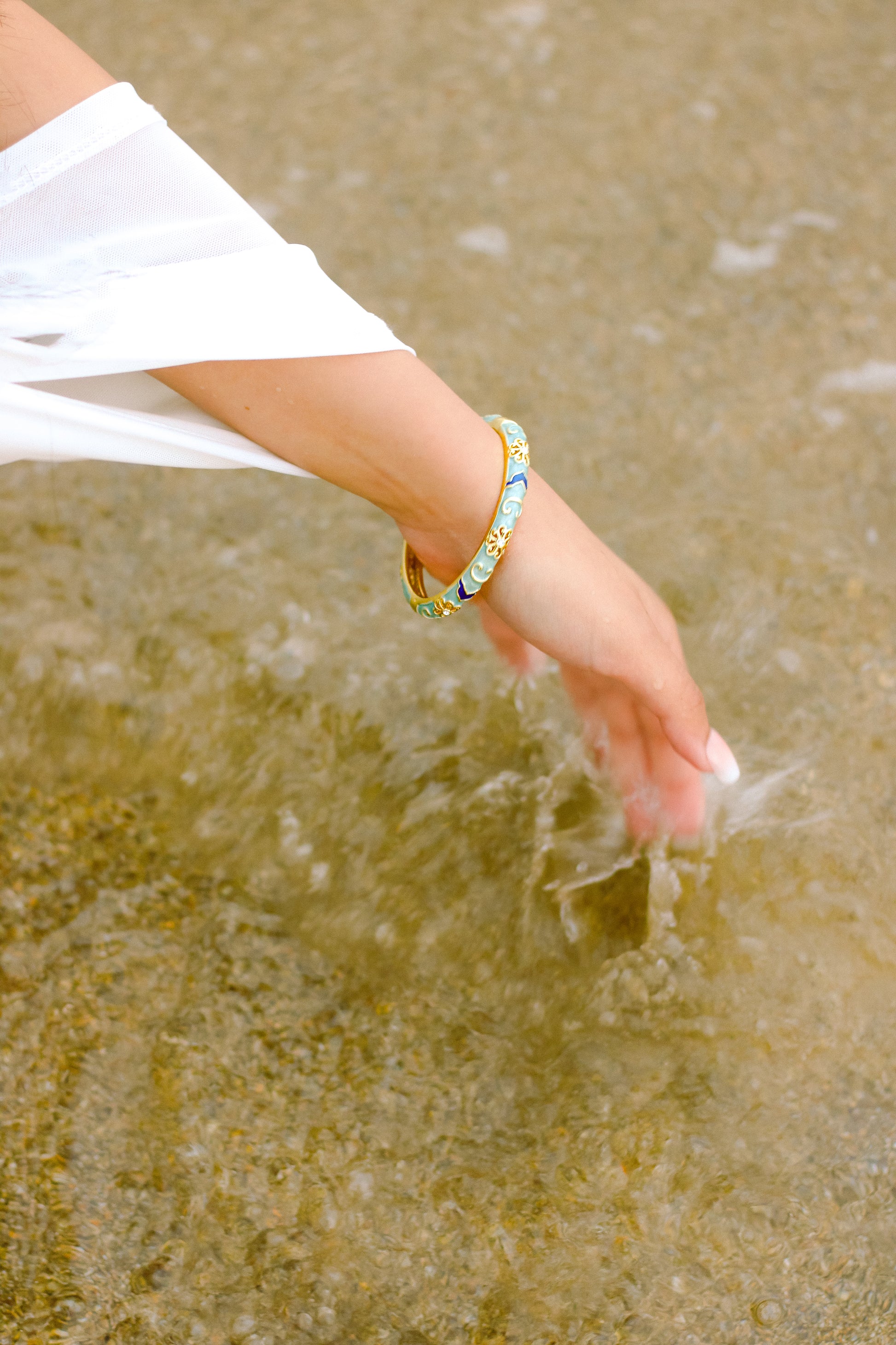 The Nila Bangle captures the serenity of deep blue waters and golden sunlight. Intricately detailed with desi-inspired enamel patterns, it’s a timeless blend of elegance and heritage. Designed with a strong, secure clasp that opens easily and fits most wrist sizes, it’s made to feel as comfortable as it is captivating.