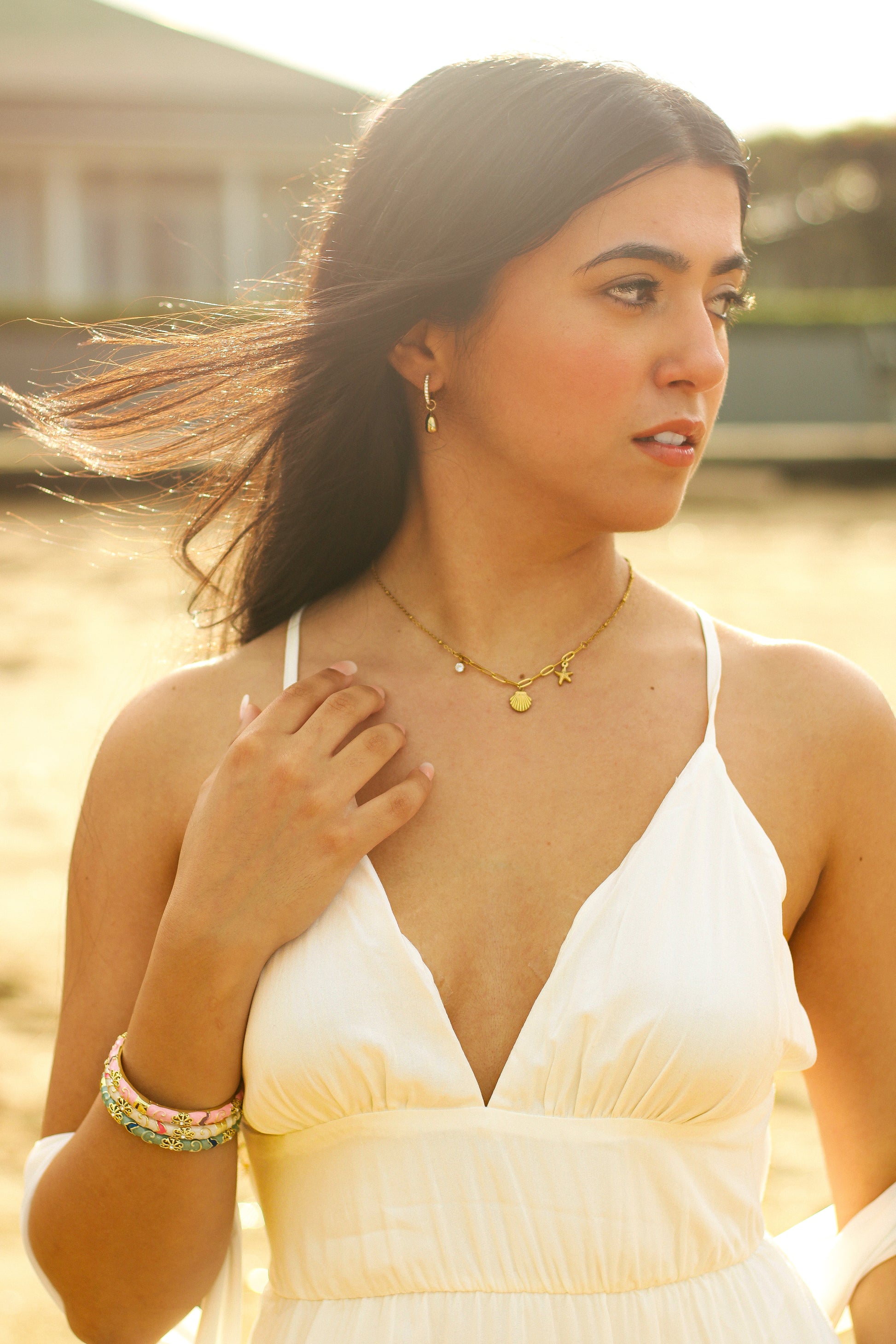 The Sahira Charm Necklace captures golden shores in every detail with a starfish, seashell, and sparkling crystal charm, it’s a dreamy fusion of summer light and timeless elegance. A versatile piece for everyday wear. If you need one piece for summer, this is it!