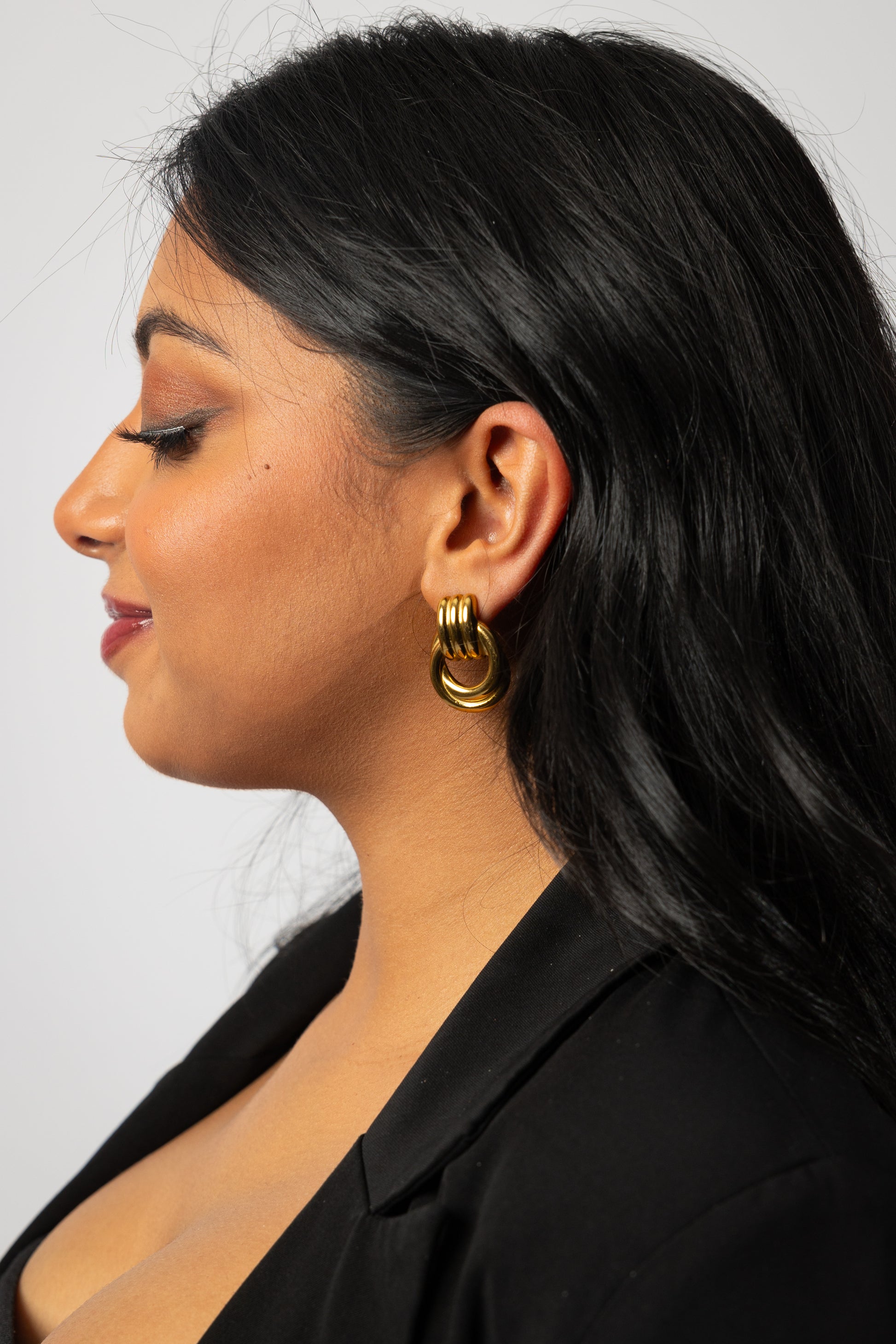 Crafted to embody balance and strength, the Synergy Earrings in gold are your go-to statement pieces. Bold yet refined, they’re made to elevate any look, from boardroom to a night out with effortless confidence.